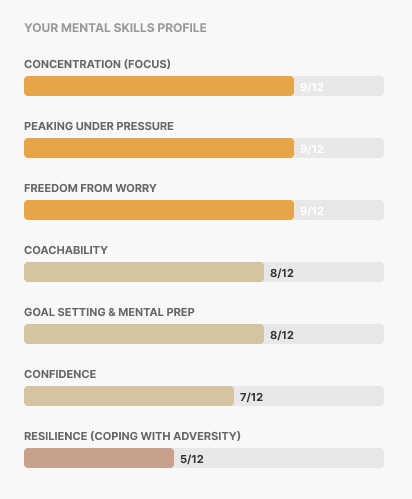 Your mental skills profile. The colors show your pattern: where you're strong, where you're solid, and where focused work will make the biggest difference.