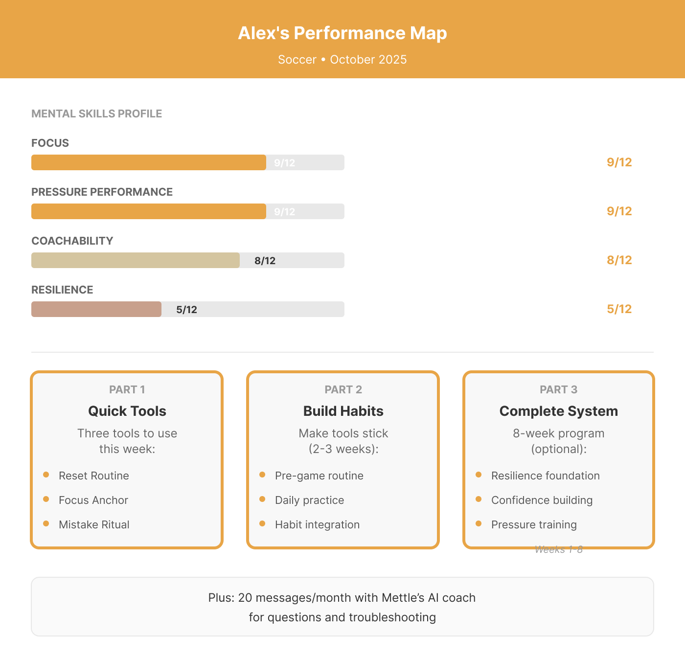 It uses the ACSI-28, a validated assessment used in sports psychology. But the language and tools are practical — not clinical. You won't feel like you're in therapy.